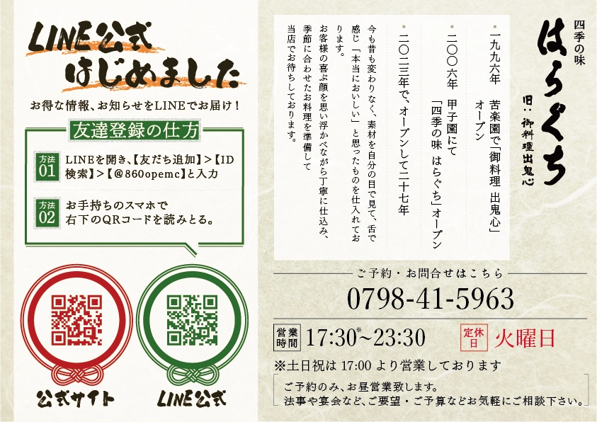 兵庫県の飲食店「四季の味 はらぐち」様のWebサイト・店舗内メニューデザイン・LINE公式アカウントの制作を担当。季節ごとの旬の食材を目利きし、常に最高の状態で提供するという大将のこだわりが、サイトを訪れた方にも伝わるような制作を意識しました。